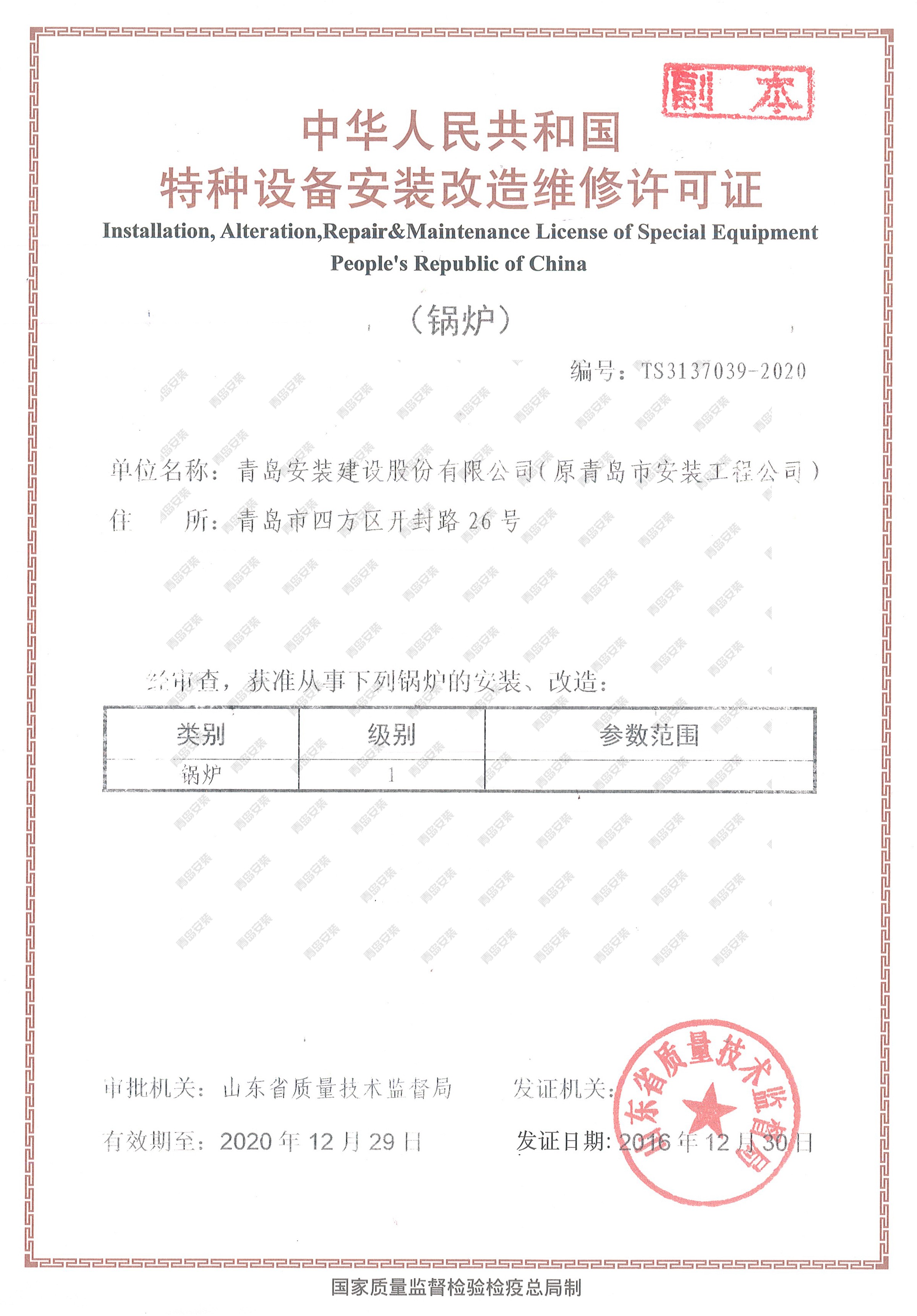 特種設(shè)備安裝改造維修許可證-鍋爐