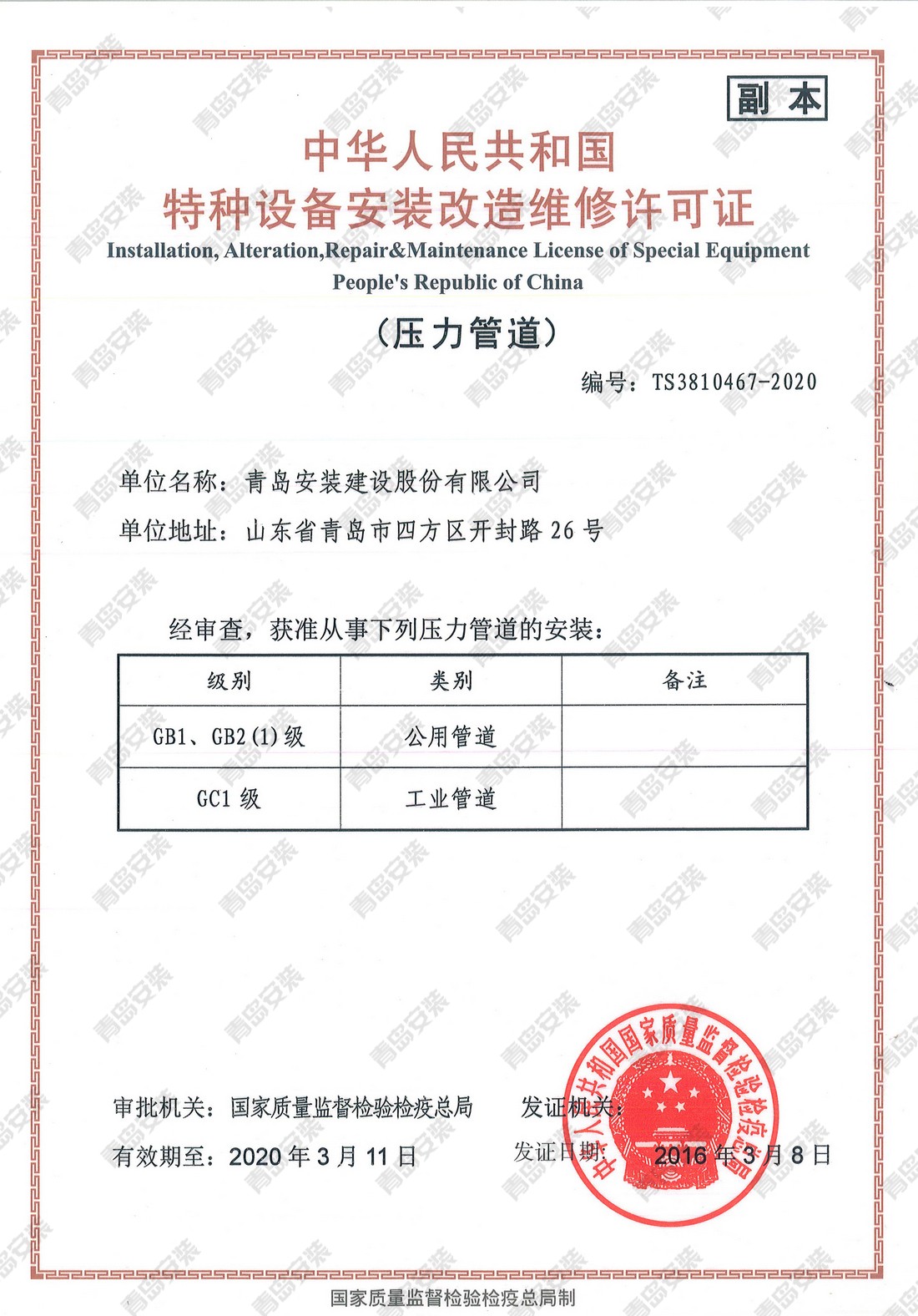 特種設(shè)備安裝改造維修許可證-壓力管道
